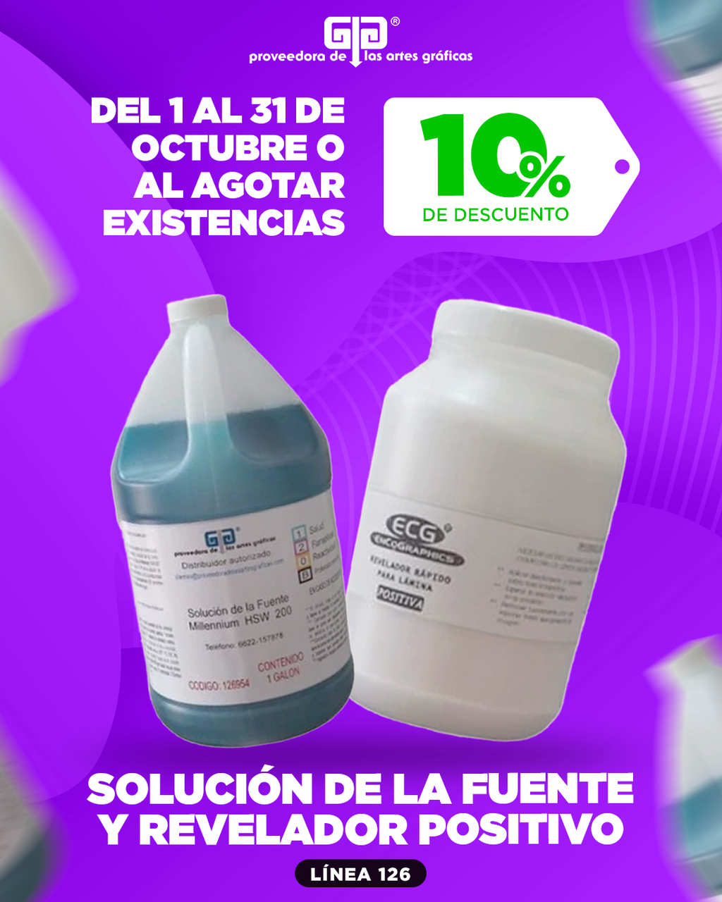 Consulte en la web por medio del buscador, SOLUCION DE LA FUENTE MILLENIUM y Revelador para placa positiva y este mes de octubre 2025 llévelos con un 10% de descuento.