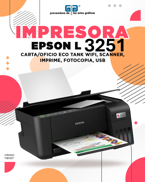 IMPRESORA EPSON MODELO L 3251, SISTEMA ECOTANK, SIN TINTAS, FORMATO DE IMPRESION TAMAÑO CARTA, CON SCANNER, IMPRESIÓN Y COPIADORA. PUERTO USB Y MODO INALAMBRICO, WIFI.