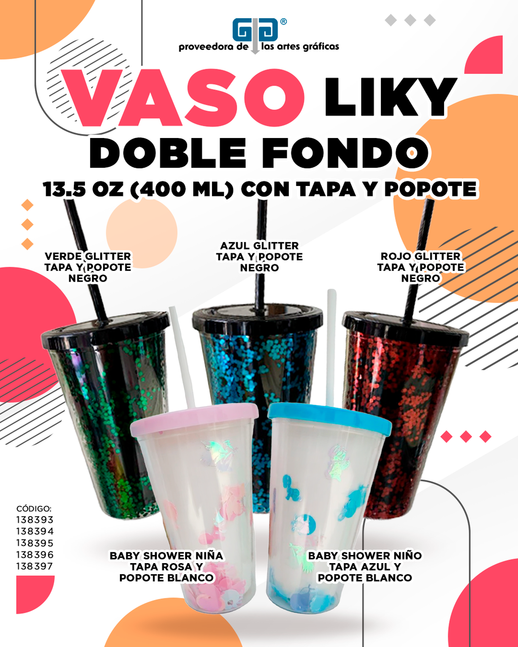 VASO LIKY GLITTER, DOBLE FONDO CON TAPA Y POPOTE
